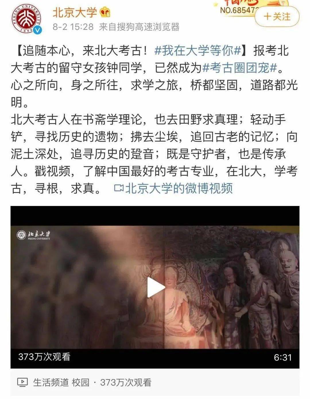 8月2日,北大发文欢迎钟芳蓉同学,授业于田野之间,树人于实践之中,并祝她在北大考古找到毕生所爱。